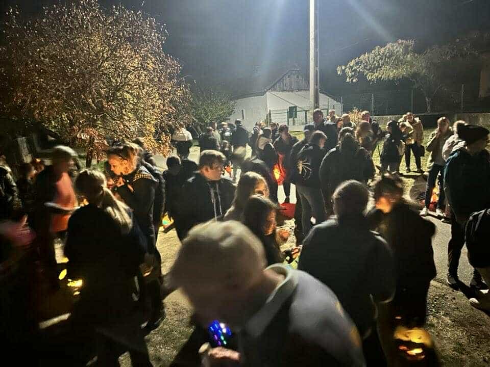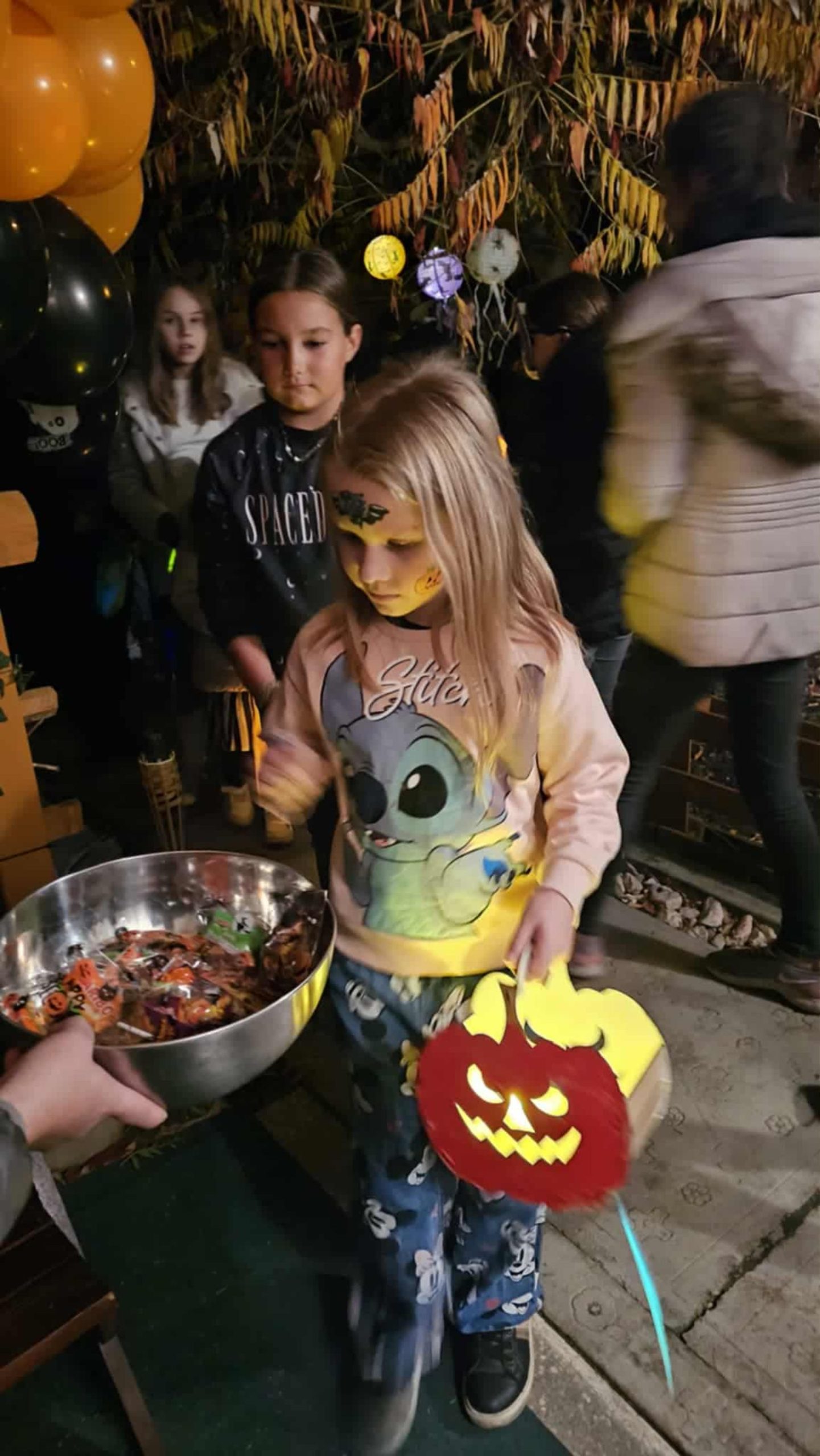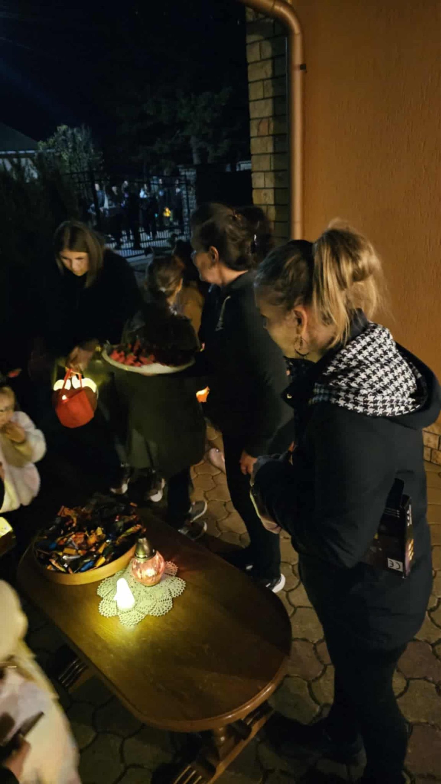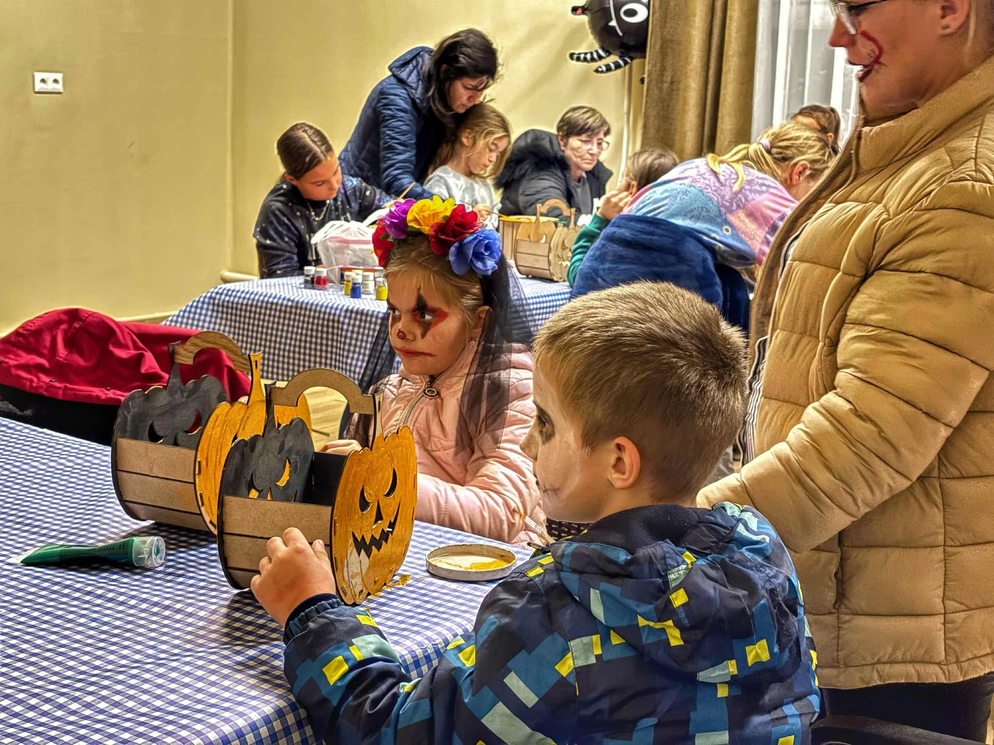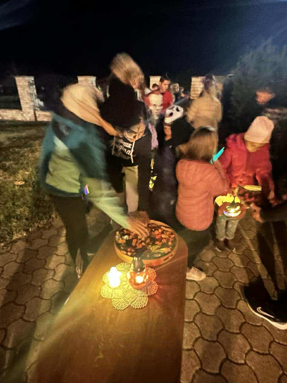 A gyerekek mosolygós arccal, nagy lelkesedéssel festették a tököket, kézműveskedtek, majd elindultunk közösen kopogtatni a faluban – „csokit vagy csalunk!” hangulatban.