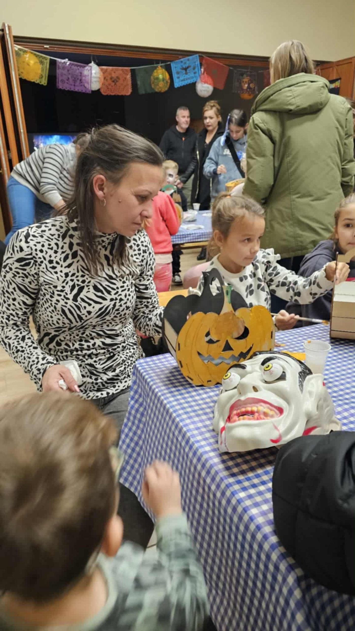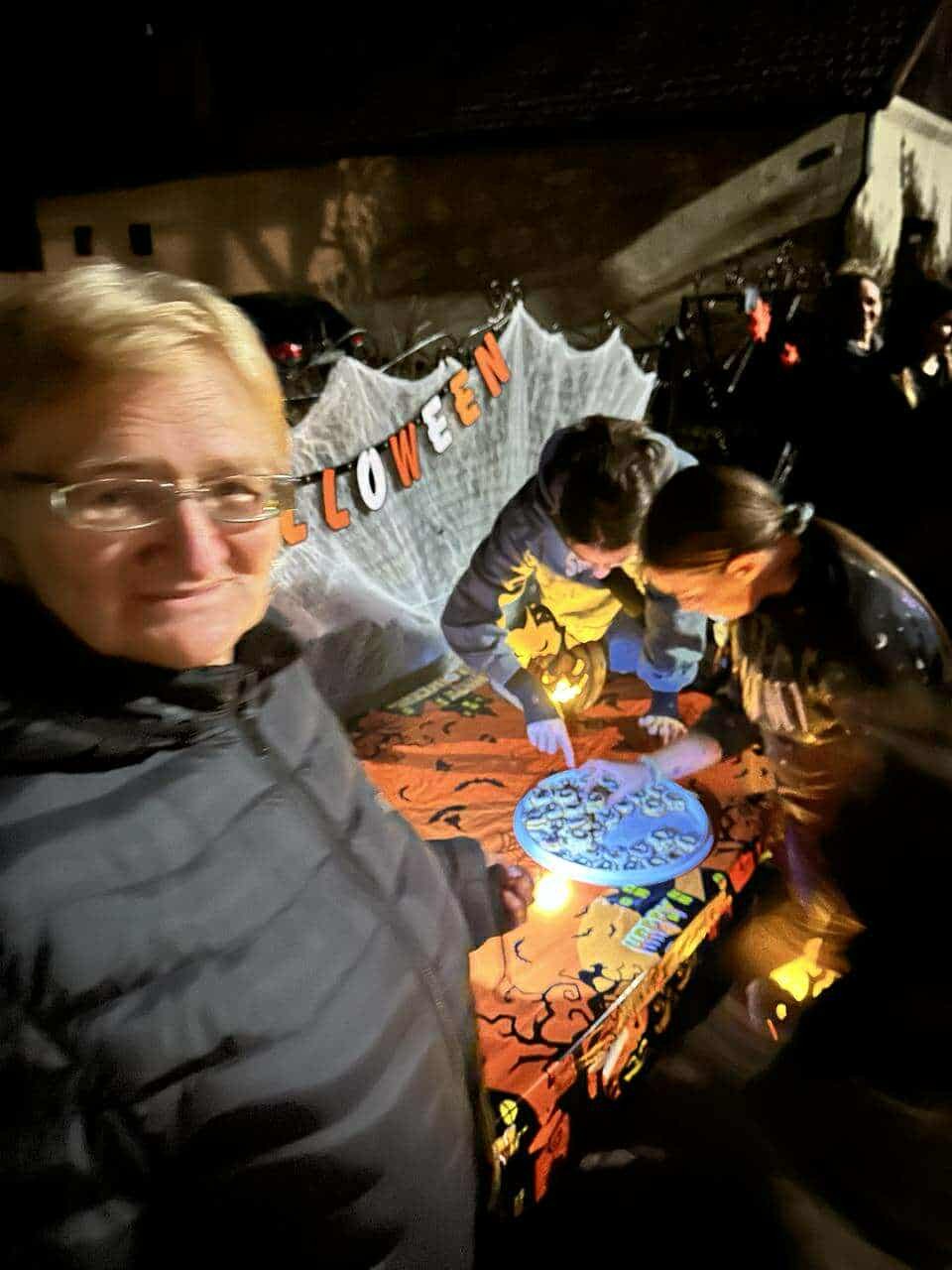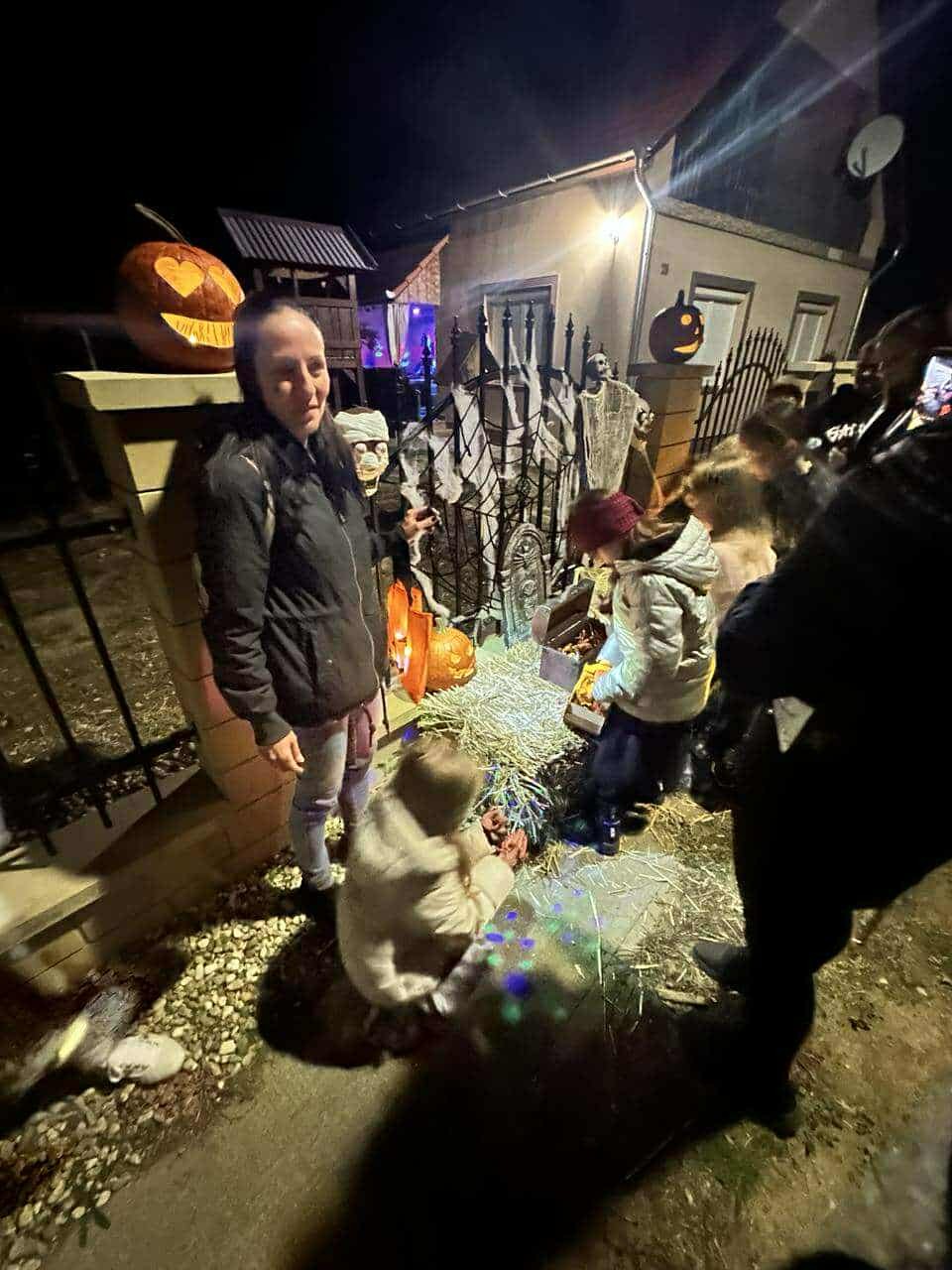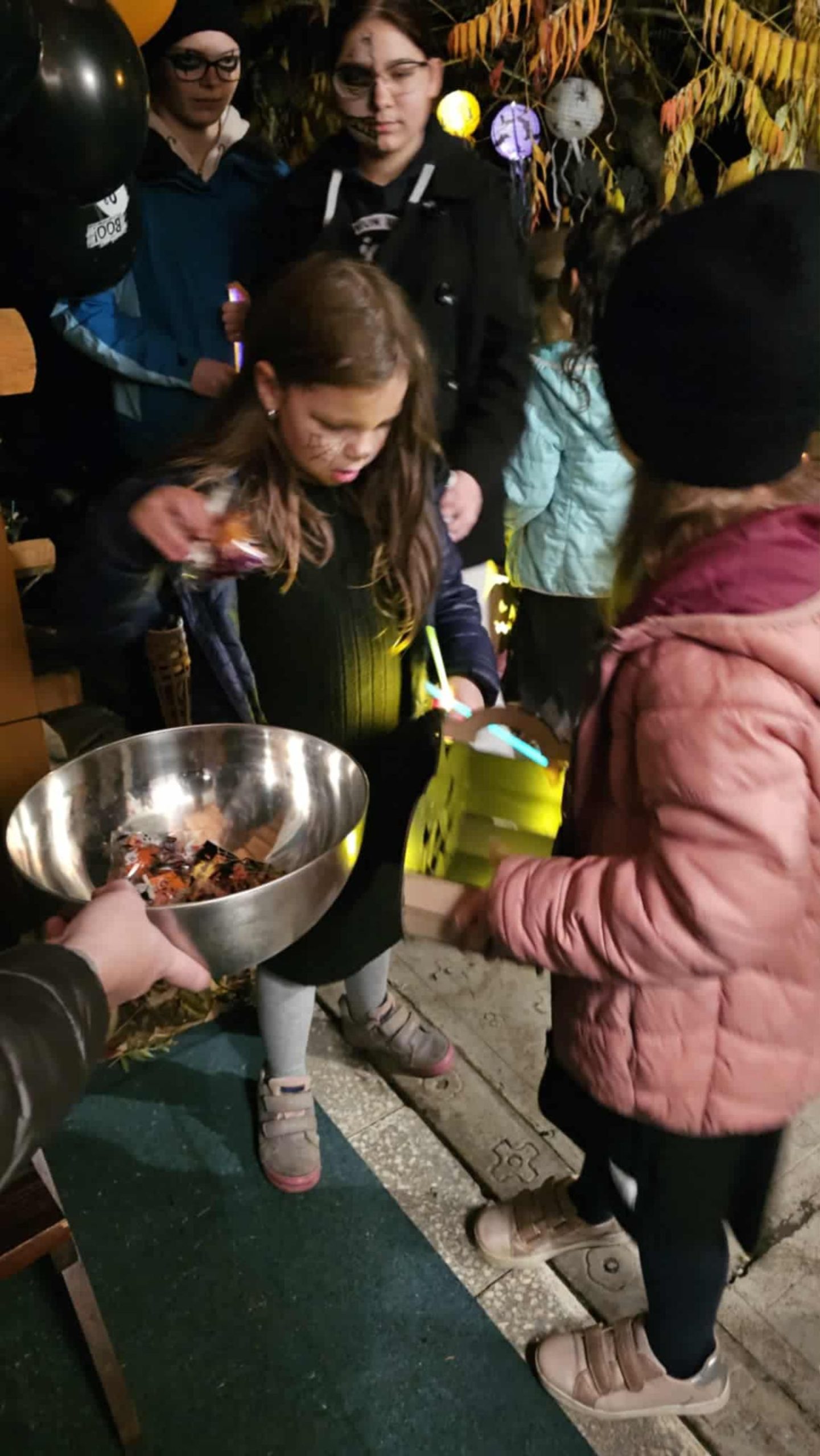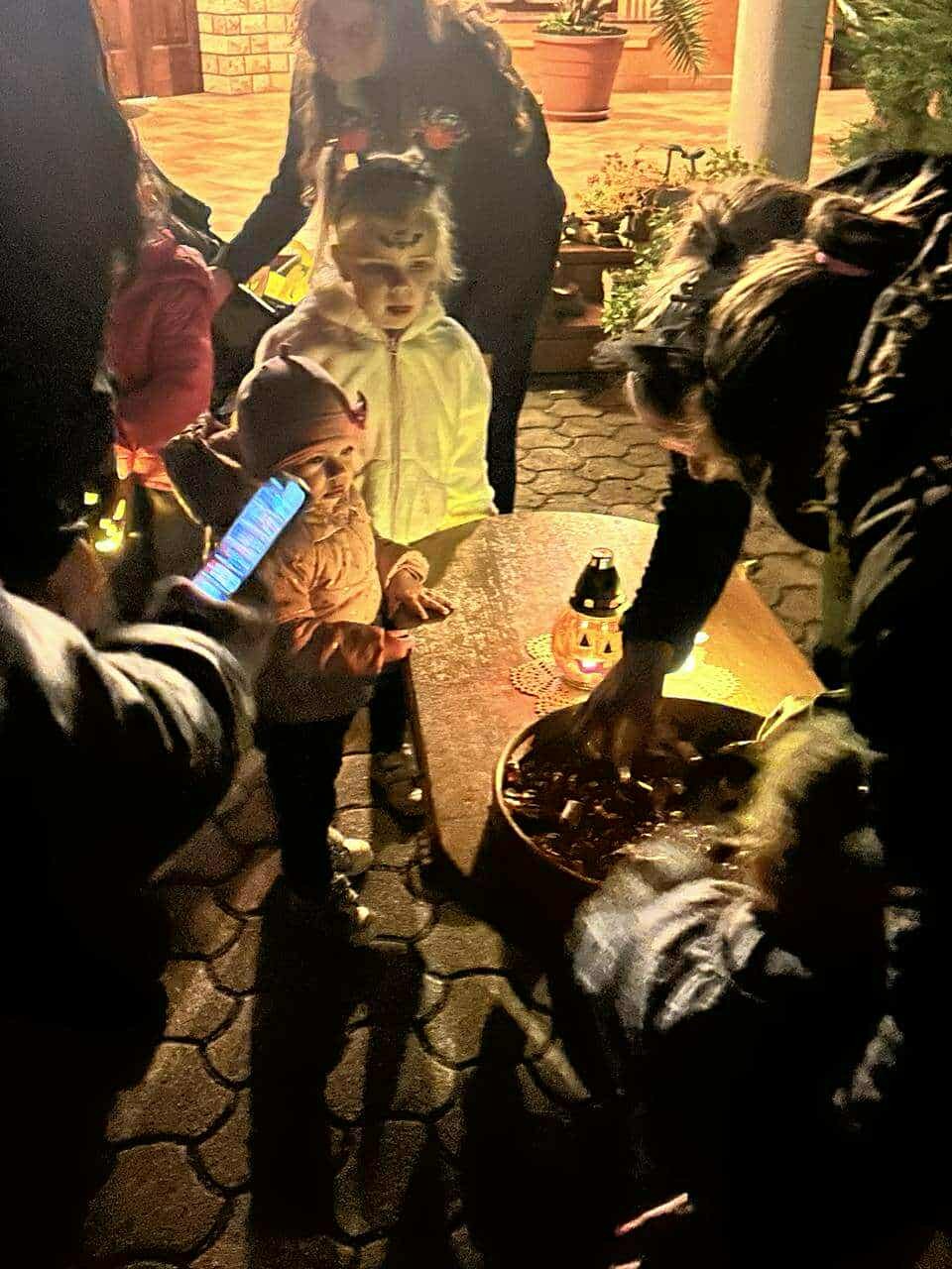 A gyerekek mosolygós arccal, nagy lelkesedéssel festették a tököket, kézműveskedtek, majd elindultunk közösen kopogtatni a faluban – „csokit vagy csalunk!” hangulatban.